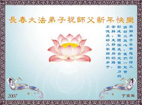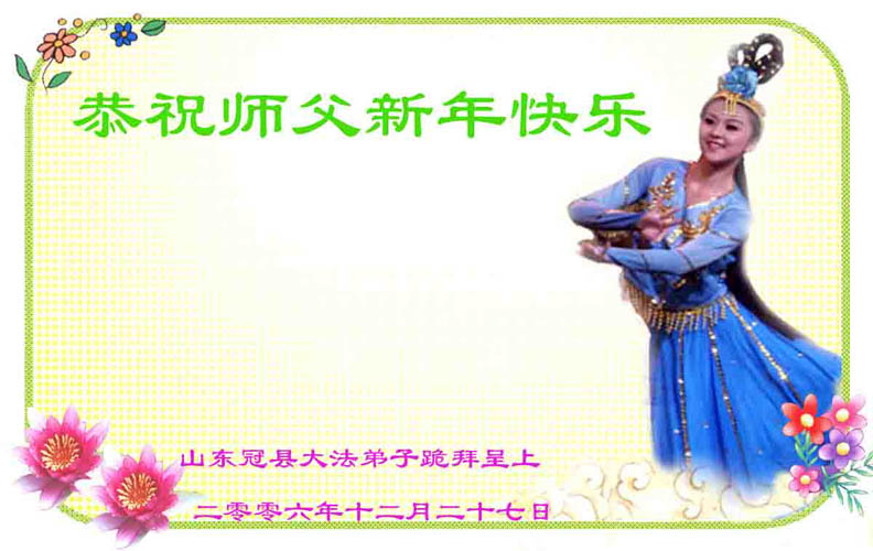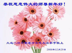 Greetings, Master! Tears ran down my face without picking up the pen, Dafa disciples in the Mainland miss you all the time! We are looking forward to the day when we will join you! When the year 2007 is around the corner, on behalf of our Dafa disciples in the Armed Police Force, we send our New Year greetings to youâ€"our great revered Master! Master, you’ve worked hard!